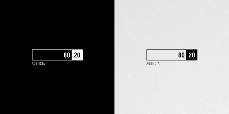 El logotipo es una representación directa de la proporción de 80/20. La selección de Akrobat, una tipografía sans serif: simple y moderna, y una paleta de colores en blanco y negro permiten destacar las imágenes creadas por la agencia sin sobrepasarlas.